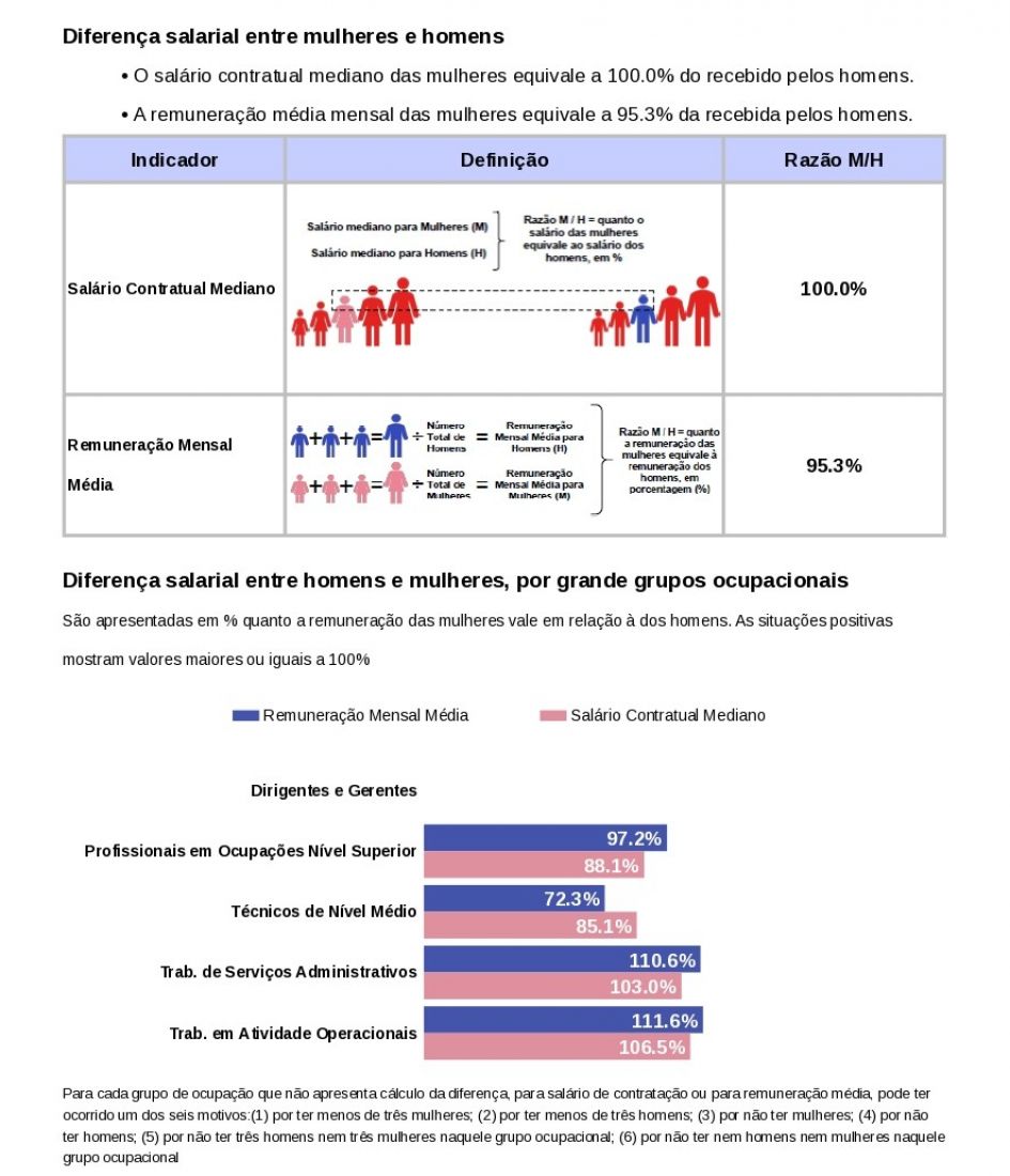 O salário contratual mediano das mulheres equivale a 100% do recebido pelos homens, mostrando equilíbrio no momento da contratação.